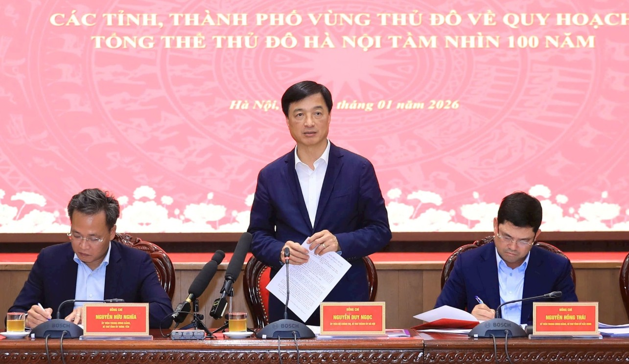 Thông tin về tiến độ trình Luật Thủ đô sửa đổi xin ý kiến Ủy ban Thường vụ Quốc hội, các ban, bộ, ngành Trung ương trong quý I-2026 và trình tại kỳ họp đầu tiên của Quốc hội khóa XVI; trình Bộ Chính trị thay thế Nghị quyết 15-NQ/TW trong tháng 2-2026; trình hồ sơ Quy hoạch tổng thể Thủ đô với tầm nhìn 100 năm theo đúng tiến độ, Bí thư Thành ủy Nguyễn Duy Ngọc cho biết, lộ trình này đòi hỏi việc giải quyết các phần việc liên quan rất khẩn trương. Vì vậy, các tỉnh bám sát lộ trình của Hà Nội để có ý kiến tham góp hiệu quả, qua đó góp phần xây dựng các trụ cột thể chế và quy hoạch phát triển Thủ đô và Vùng Thủ đô mang tính lâu dài, bền vững trong kỷ nguyên mới.