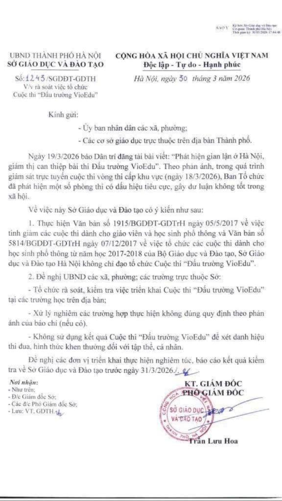 Theo thông tin từ Sở GD-ĐT Hà Nội, đơn vị đã nhận được phản ánh về dấu hiệu tiêu cực trong quá trình tổ chức Đấu trường VioEdu. Trên cơ sở đó, Sở đề nghị UBND các xã, phường cùng các trường trực thuộc tổ chức rà soát, kiểm tra việc triển khai cuộc thi tại các cơ sở giáo dục trên địa bàn; đồng thời yêu cầu xử lý nghiêm những trường hợp thực hiện không đúng quy định như các phản ánh đã nêu. Sở cũng khẳng định không chỉ đạo tổ chức cuộc thi “Đấu trường VioEdu”.