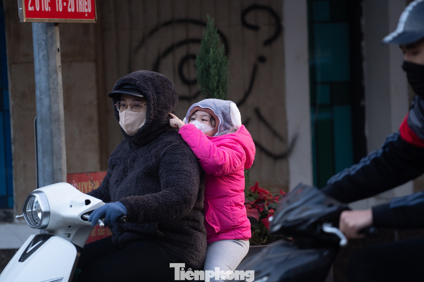 Trong cái rét buổi sáng, người dân ra đường đều khoác áo mưa, trùm kín mít để ngăn gió lạnh thốc vào người.