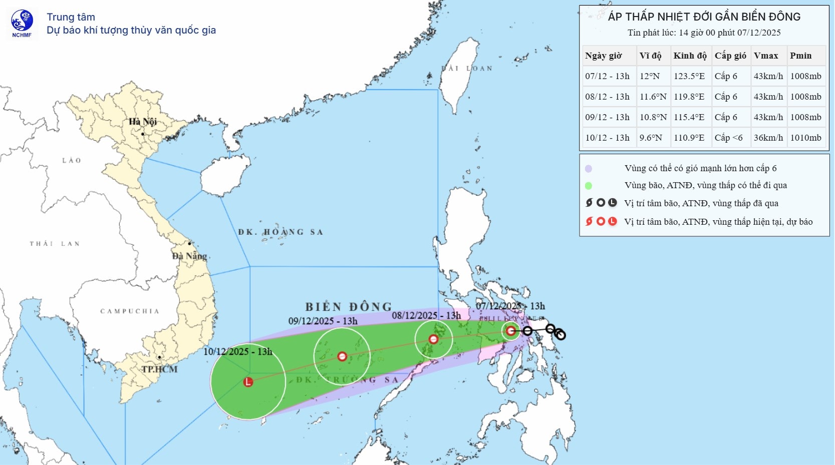 Bản đồ dự báo quỹ đạo và cường độ áp thấp nhiệt đới phát lúc 14h ngày 7-12. Ảnh: Nchmf