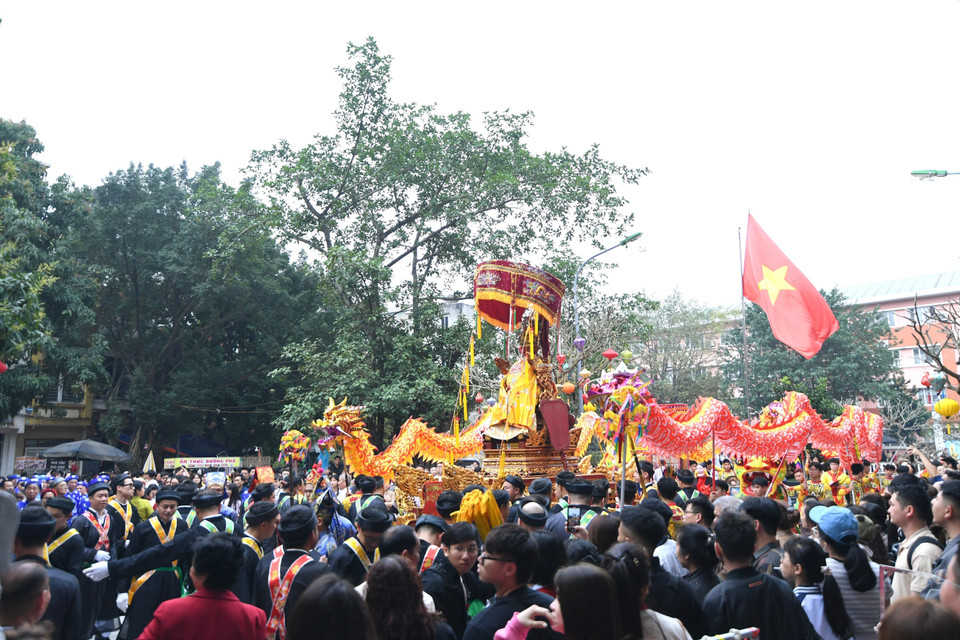 Lễ rước Đức Thánh từ Đình Thờ sắc xuống Đại đình. (Ảnh: Khánh Hòa/TTXVN)