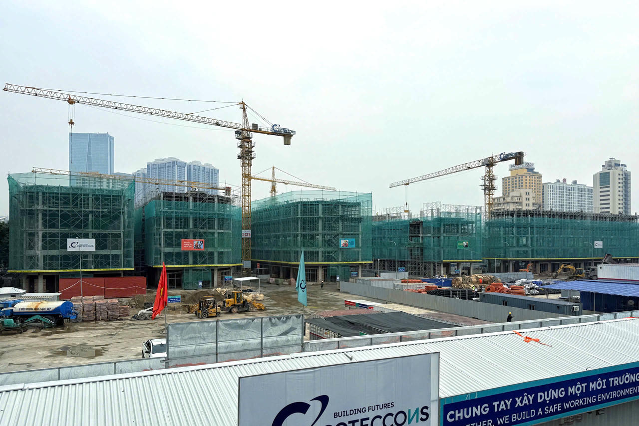 Tại Dự án đầu tư xây dựng tổ hợp hỗn hợp trung tâm thương mại, dịch vụ, văn hóa (số 148 Giảng Võ), các công nhân và máy móc đang tấp nập thi công.