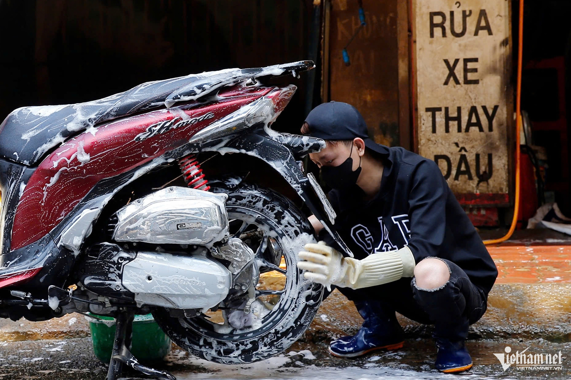 Tại cửa hàng rửa xe máy ở khu tập thể Trung Tự, mỗi người một công đoạn để đáp ứng nhanh số lượng khách hàng có nhu cầu.
