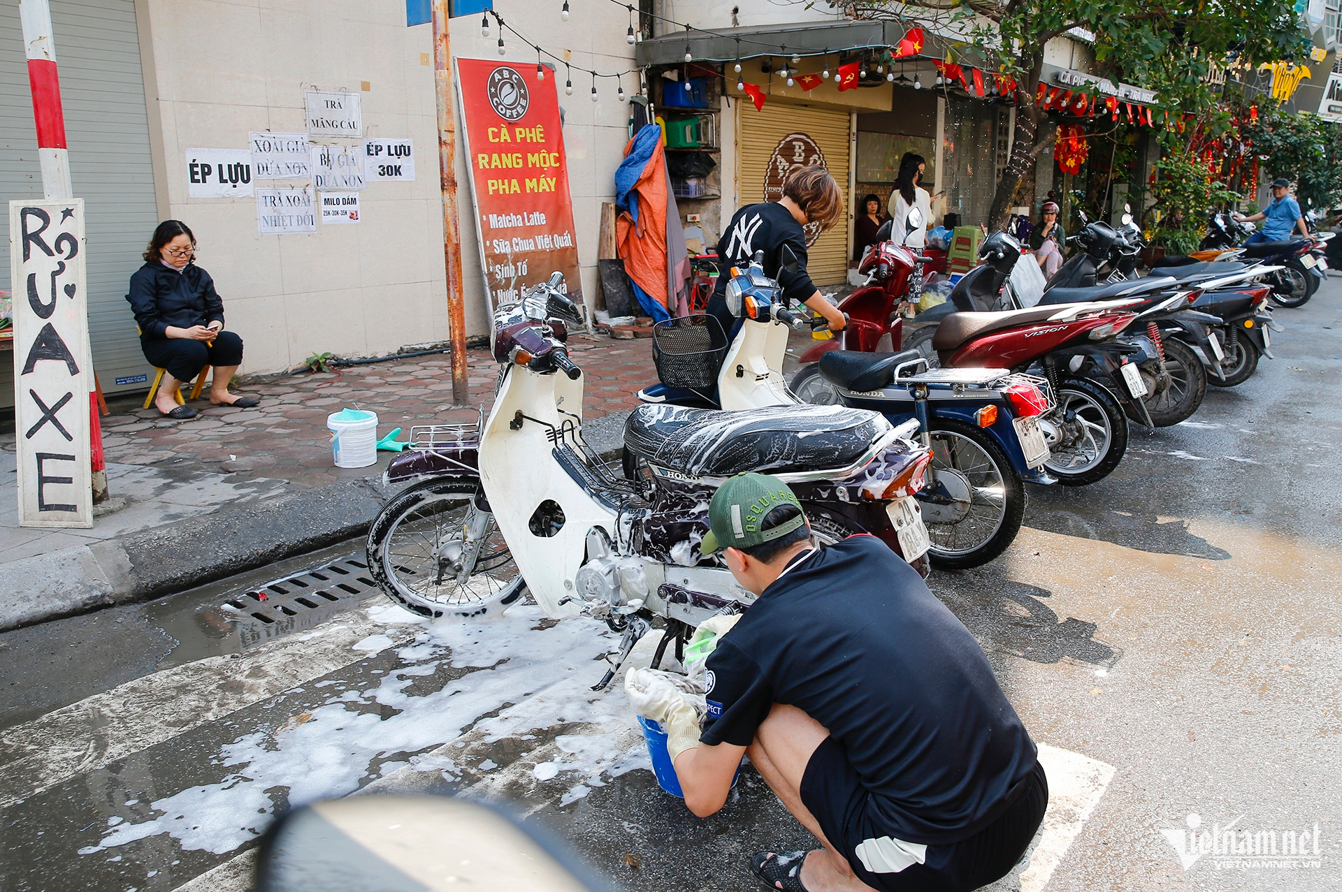 Trên phố Nguyễn Ngọc Doãn, xe máy xếp hàng chờ đến lượt rửa và thay dầu máy. Tiền công phục vụ tại đây là 50 nghìn/xe.