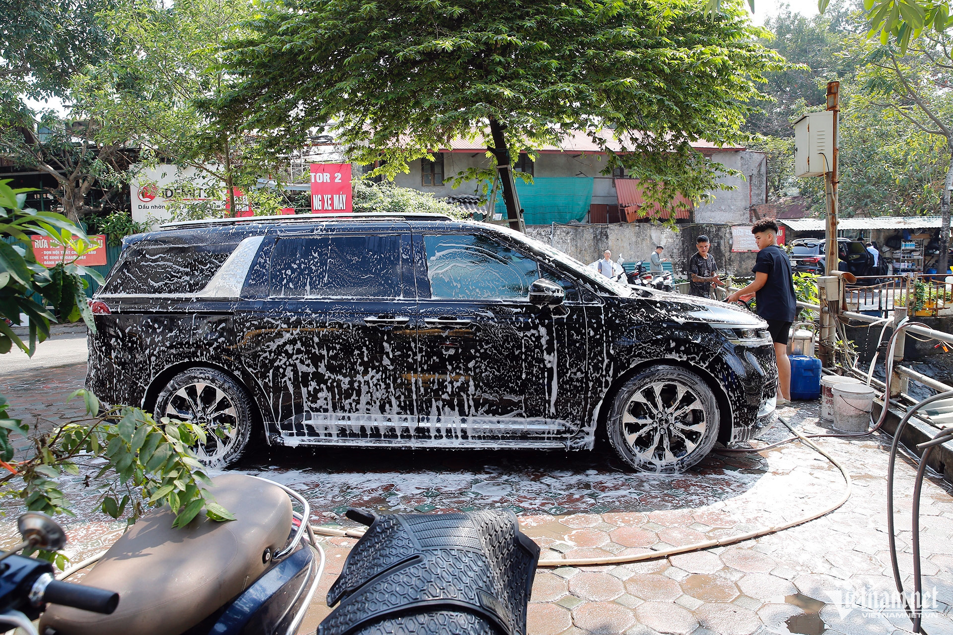 Do thợ rửa xe đã về quê ăn Tết, anh Vương cùng các thành viên trong gia đình phải tập trung cùng nhau phục vụ khách.