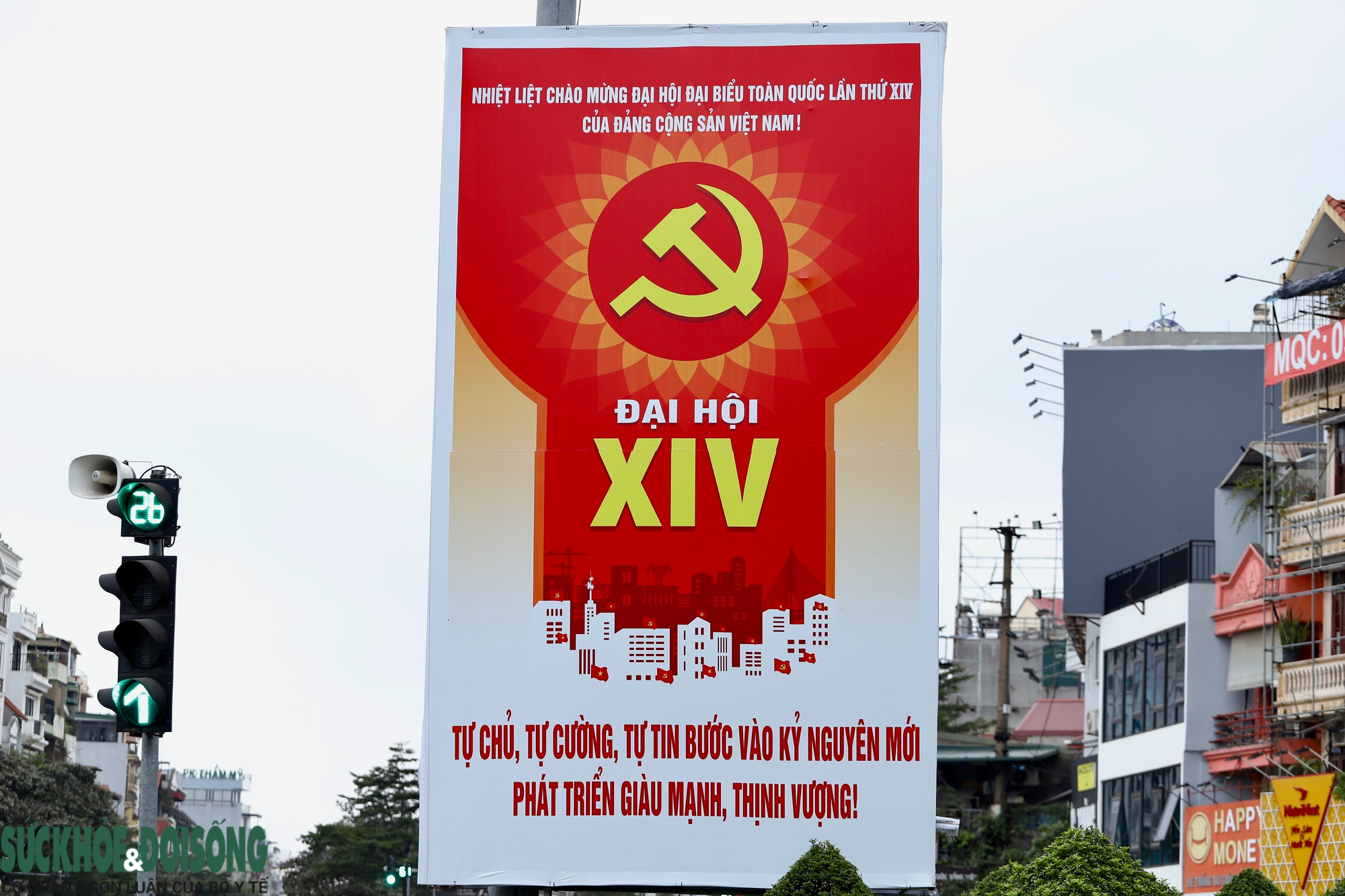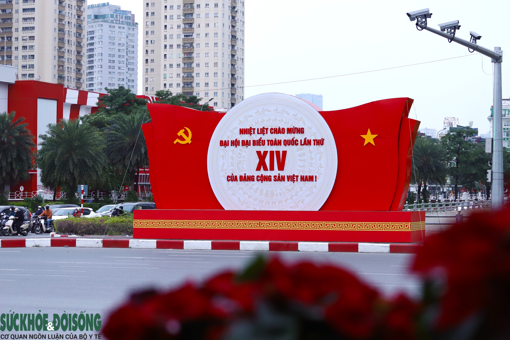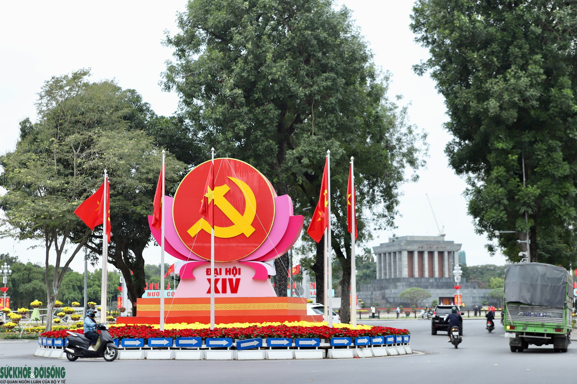 Biểu tượng búa liềm, cờ Đảng, cờ Tổ quốc được bố trí trang trọng tại nút giao Điện Biên Phủ - Độc Lập - Chu Văn An, chào mừng Đại hội đại biểu toàn quốc lần thứ XIV của Đảng; phía sau là Lăng Chủ tịch Hồ Chí Minh.