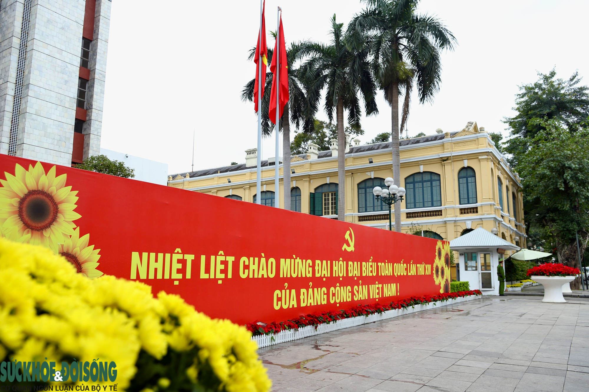 Pano chào mừng Đại hội đại biểu toàn quốc lần thứ XIV của Đảng được in khổ lớn, bố trí trang trọng, phía dưới trang trí hoa tạo điểm nhấn.