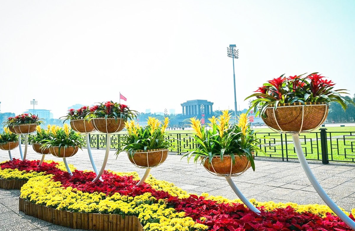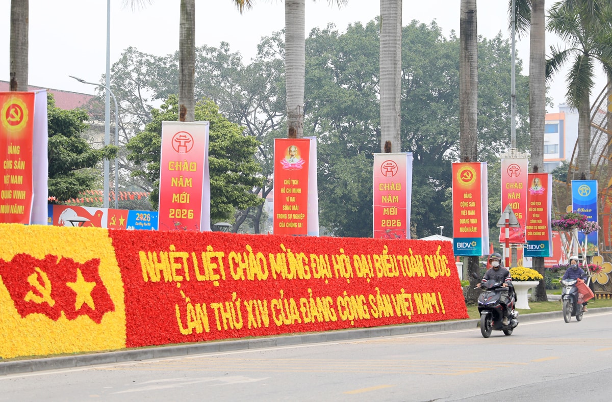 Cụm hoa trang trí chào mừng Đại hội đại biểu toàn quốc lần thứ XIV của Đảng tại xã Đông Anh.