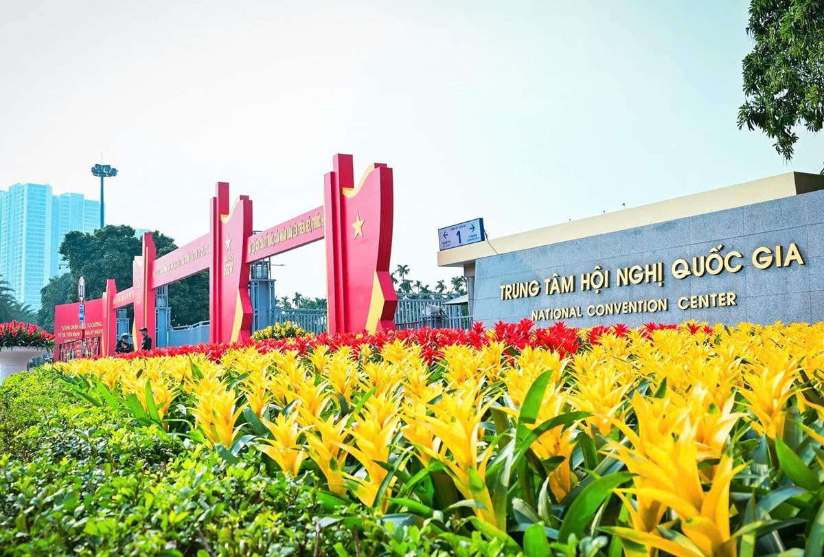 Những cụm hoa trang trí bắt mắt tại Trung tâm Hội nghị quốc gia - nơi diễn ra Đại hội đại biểu toàn quốc lần thứ XIV của Đảng.