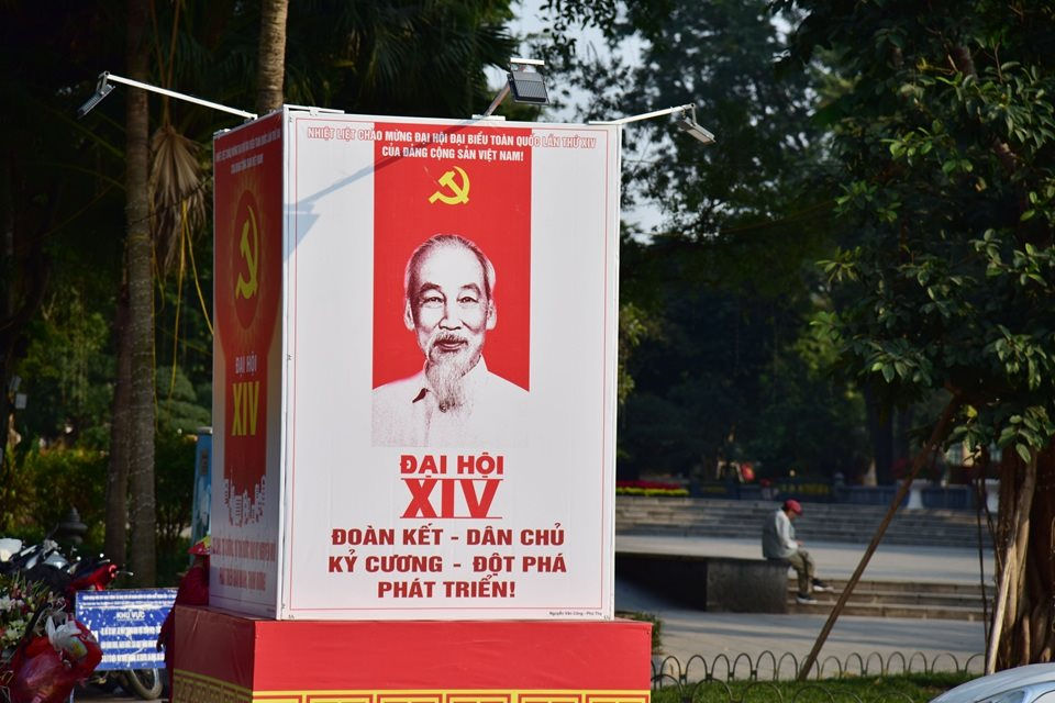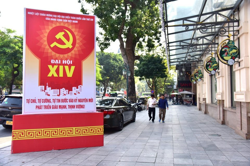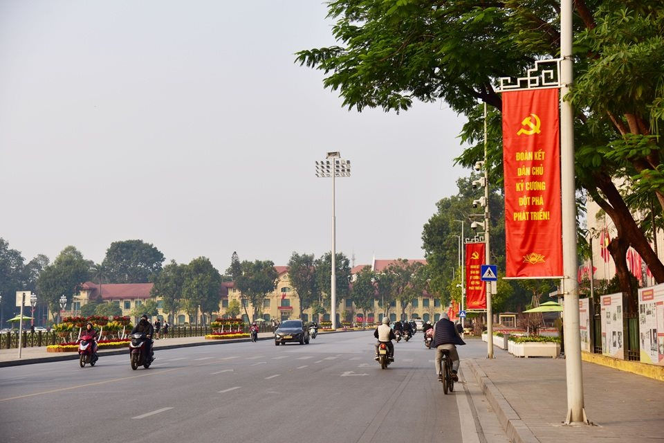 Các tấm pano, áp phích tại các góc phố đang góp phần tô điểm thêm sắc đỏ niềm tin, thể hiện tinh thần đoàn kết, khát vọng phát triển và niềm tin sắt son vào Đảng, vào tương lai tươi sáng của đất nước. Ảnh Thái Anh