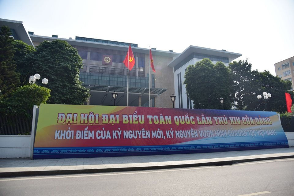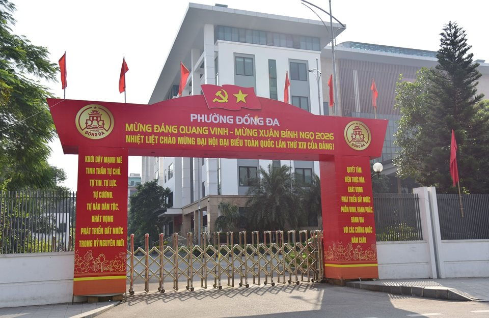 Trụ sở Đảng ủy, Ủy ban nhân dân phường Đống Đa được trang trí với các băng rôn đầy sắc đỏ, với các thông điệp mạnh mẽ hào hùng chào mừng Đại hội Đảng XIV. Ảnh: Thái Anh
