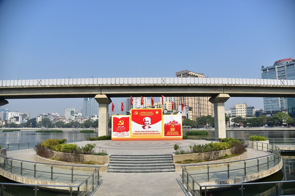 Khu vực Ô Chợ Dừa nổi bật với pano tuyên truyền chào mừng Đại hội Đảng. Ảnh: Thái Anh