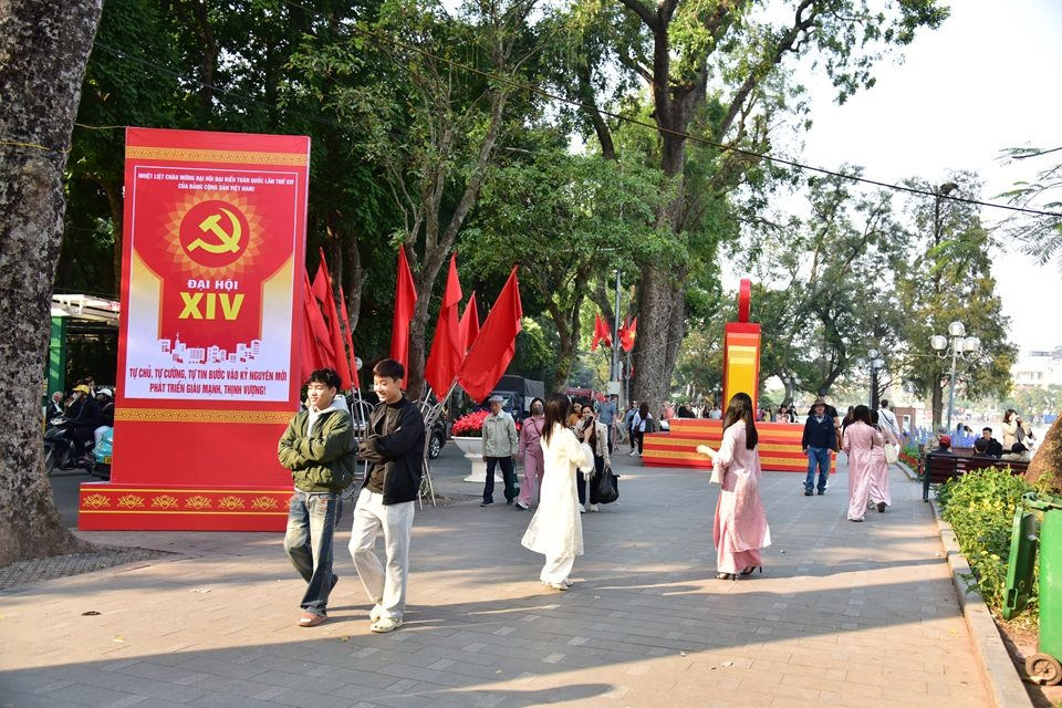 Tại Khu vực Hồ Gươm các pano, áp phích được trang hoàng rực rỡ sắc đỏ, thể hiện tinh thần đoàn kết, niềm tin của nhân dân Thủ đô hướng về Đại hội Đảng XIV thu hút đông đảo người dân và du khách ghi lại khoảnh khắc đẹp tại đây. Ảnh: Thái Anh