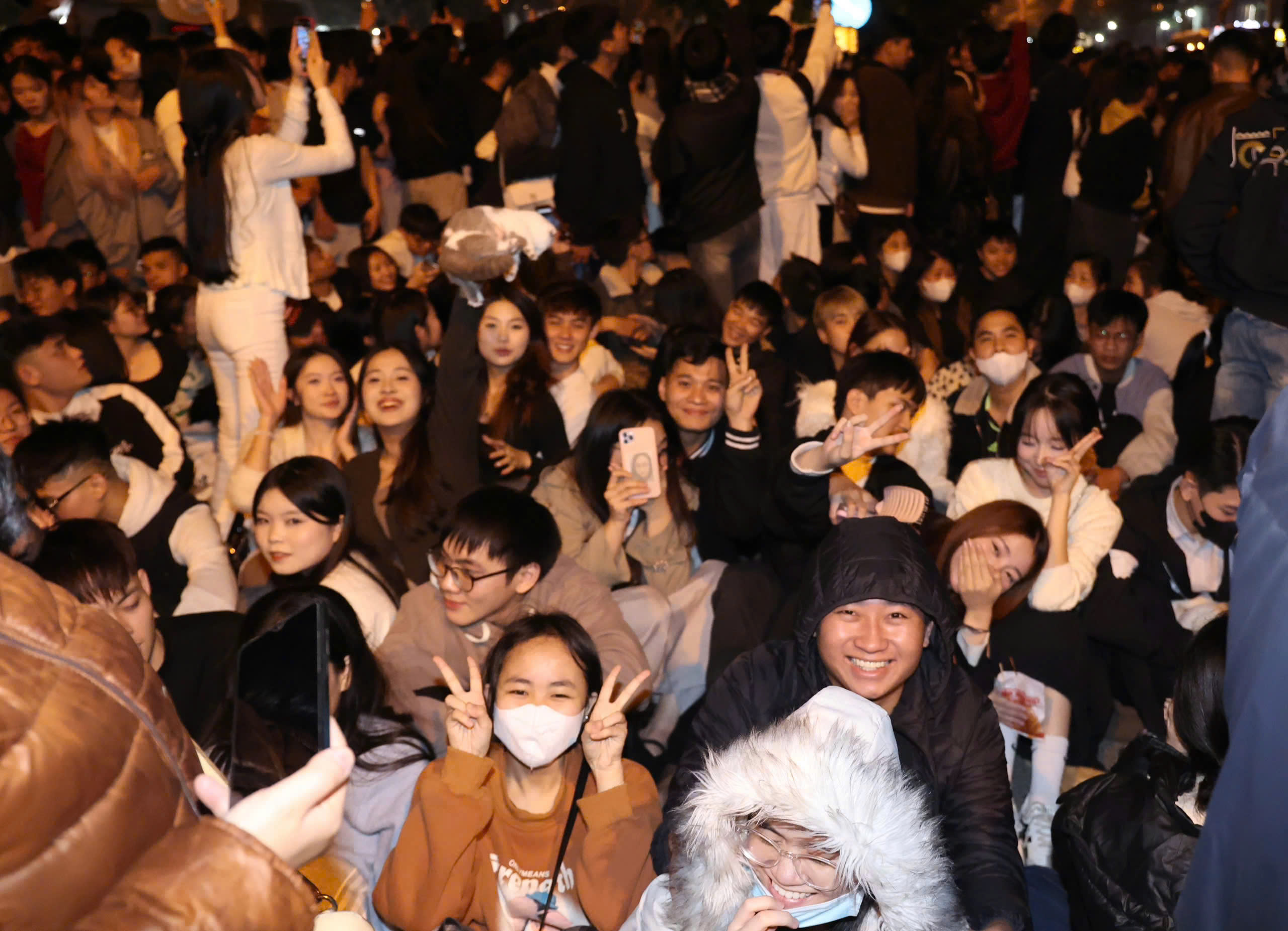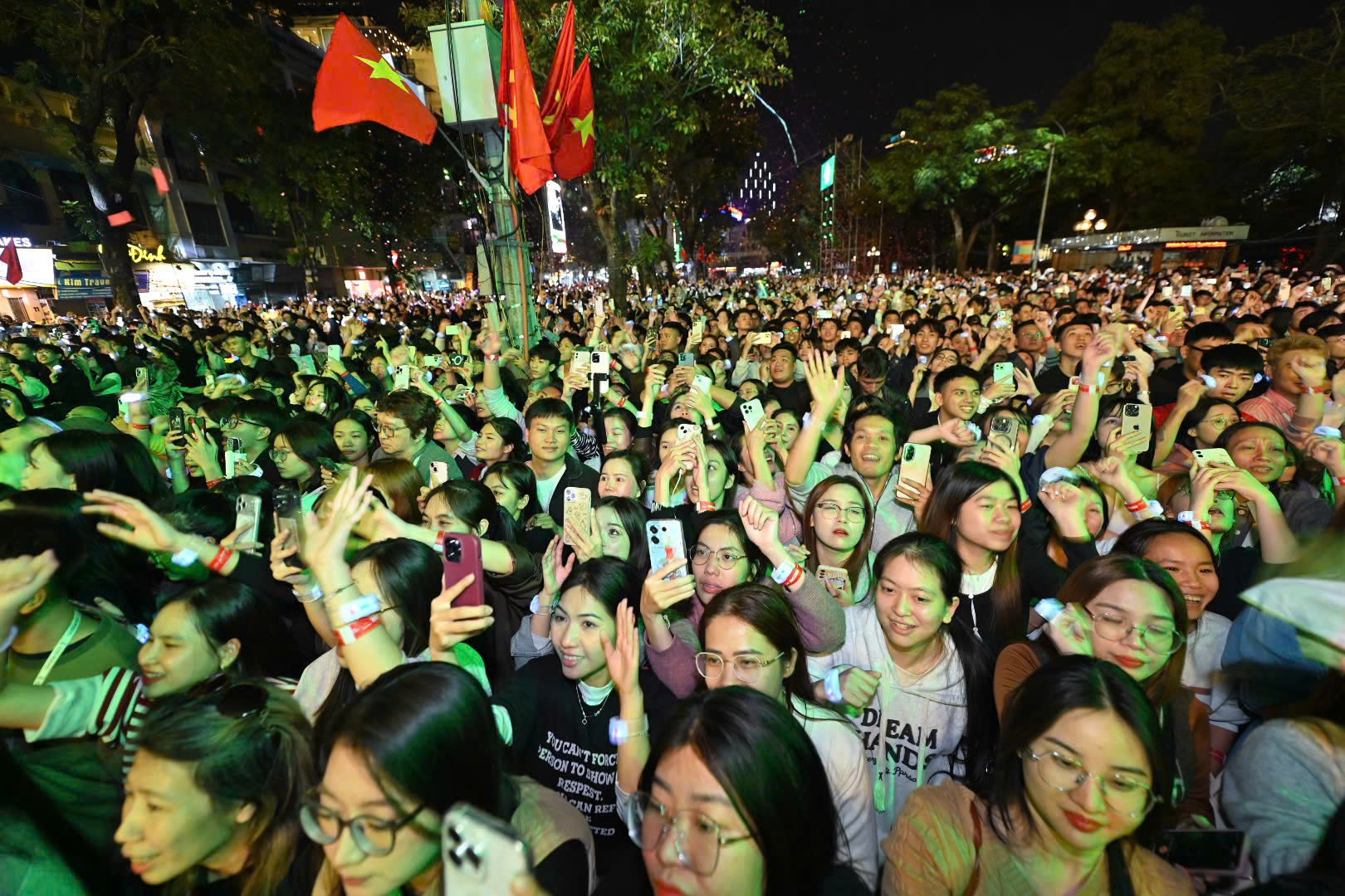 Các bạn trẻ đổ về khu vực hồ Hoàn Kiếm rất đông để chào năm mới 2026. Ảnh: TIẾN CƯỜNG