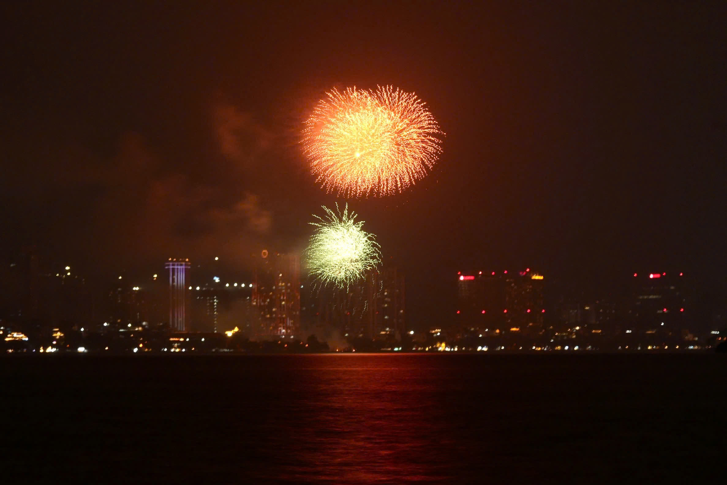 Pháo hoa rực rỡ trên hồ Văn Quán. Ảnh: TIẾN CƯỜNG
