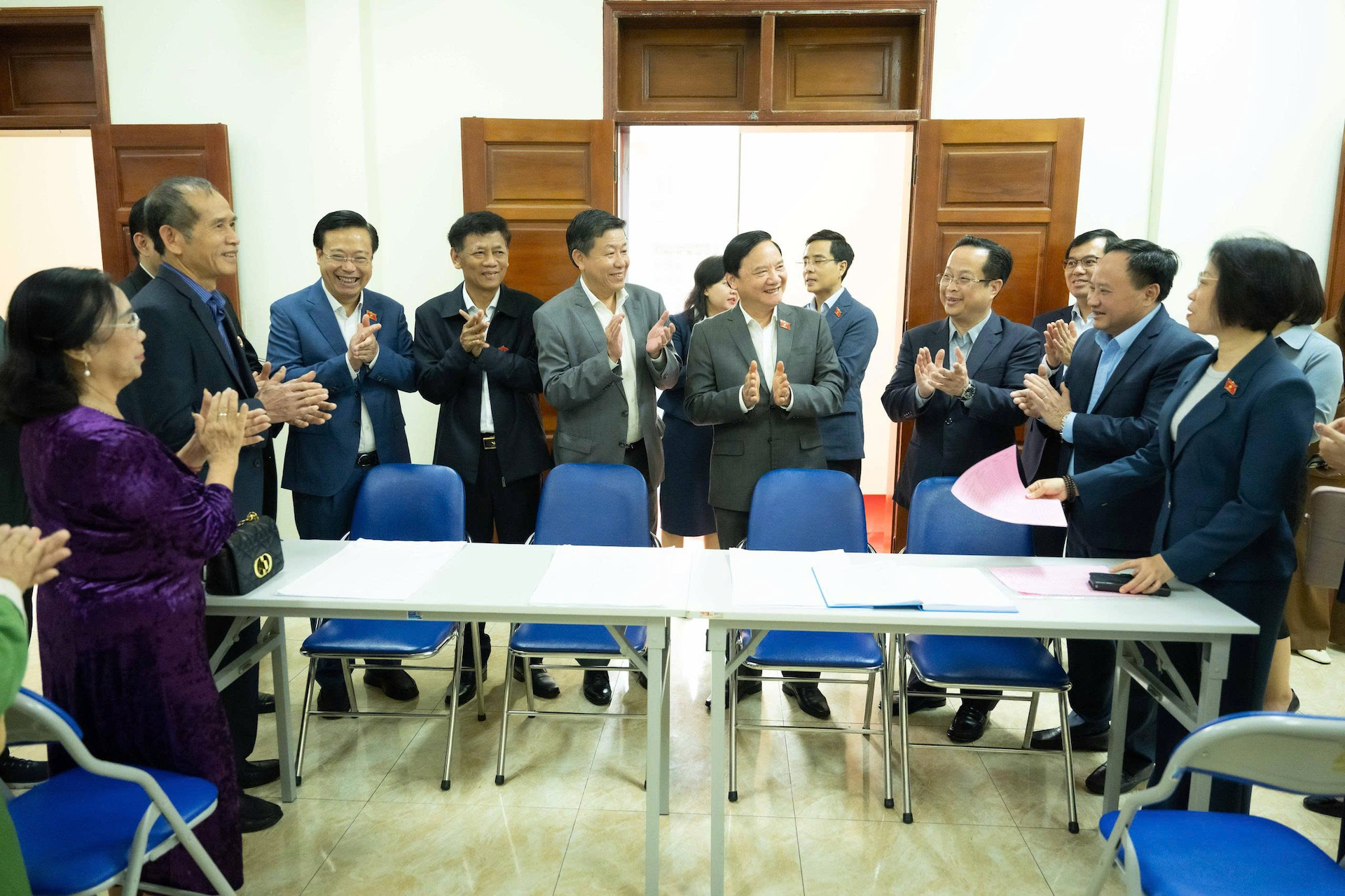 Phó chủ tịch Quốc hội Nguyễn Khắc Định và đoàn công tác kiểm tra công tác bầu cử tại Hà Nội. Ảnh: CAO HOÀNG