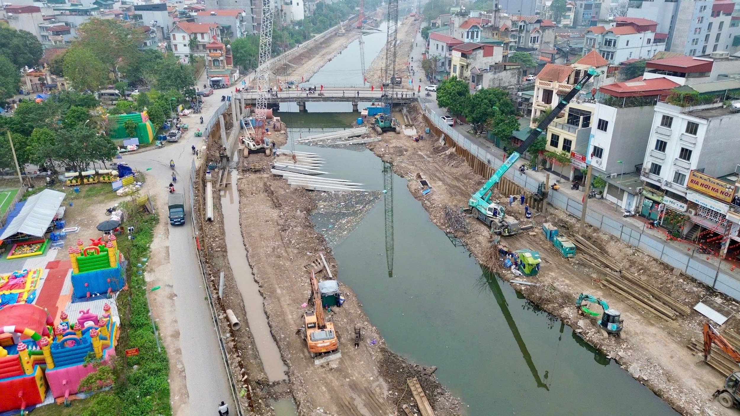 Thi công Dự án đầu tư xây dựng công trình khẩn cấp cải tạo tuyến hạ lưu sông Kim Ngưu nối sông Tô Lịch với Trạm bơm Yên Sở (đoạn qua địa bàn xã Đại Thanh). Ảnh: Quang Thái