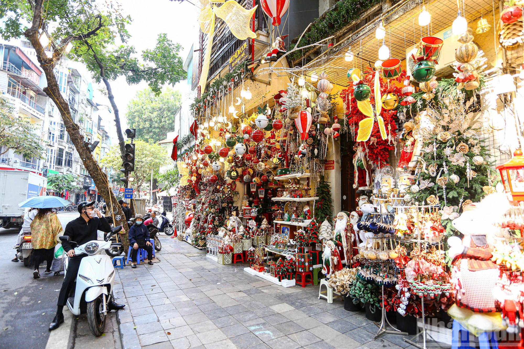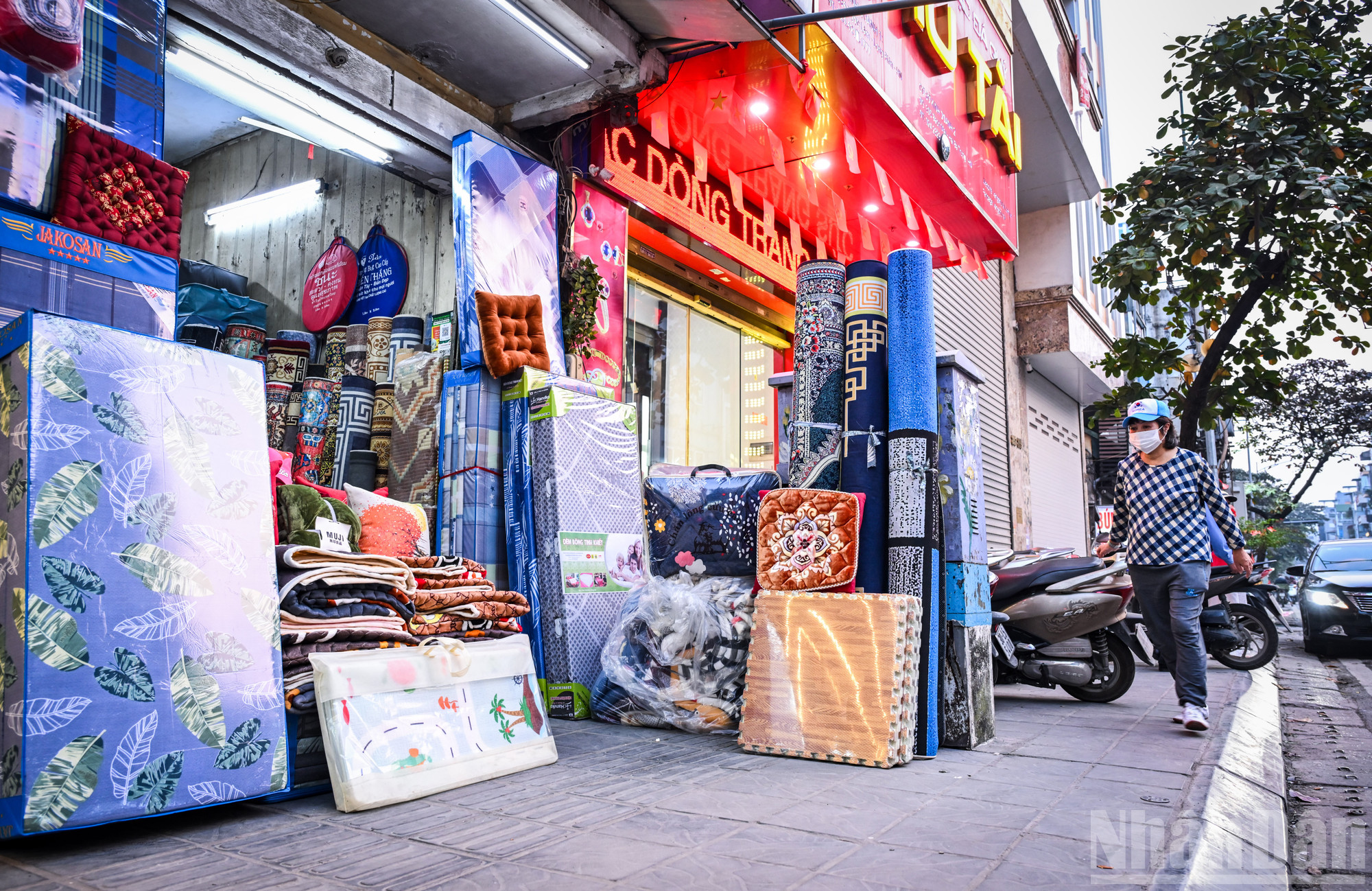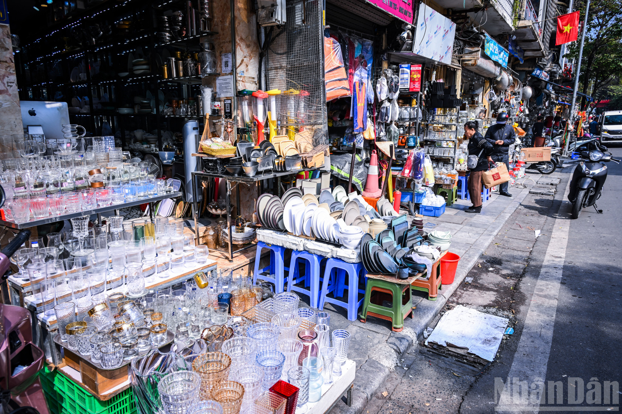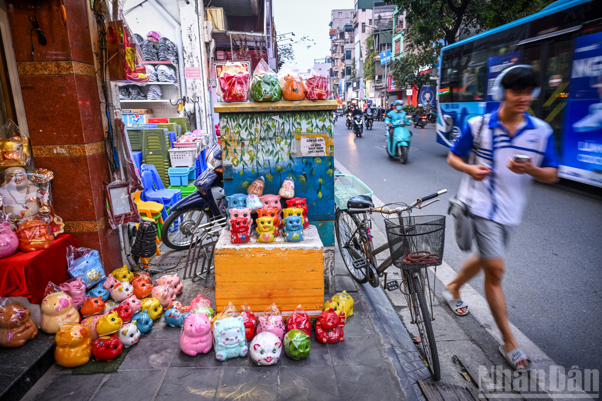 Các cửa hàng trên phố Hàng Khoai bày hàng hóa tràn kín cả vỉa hè.