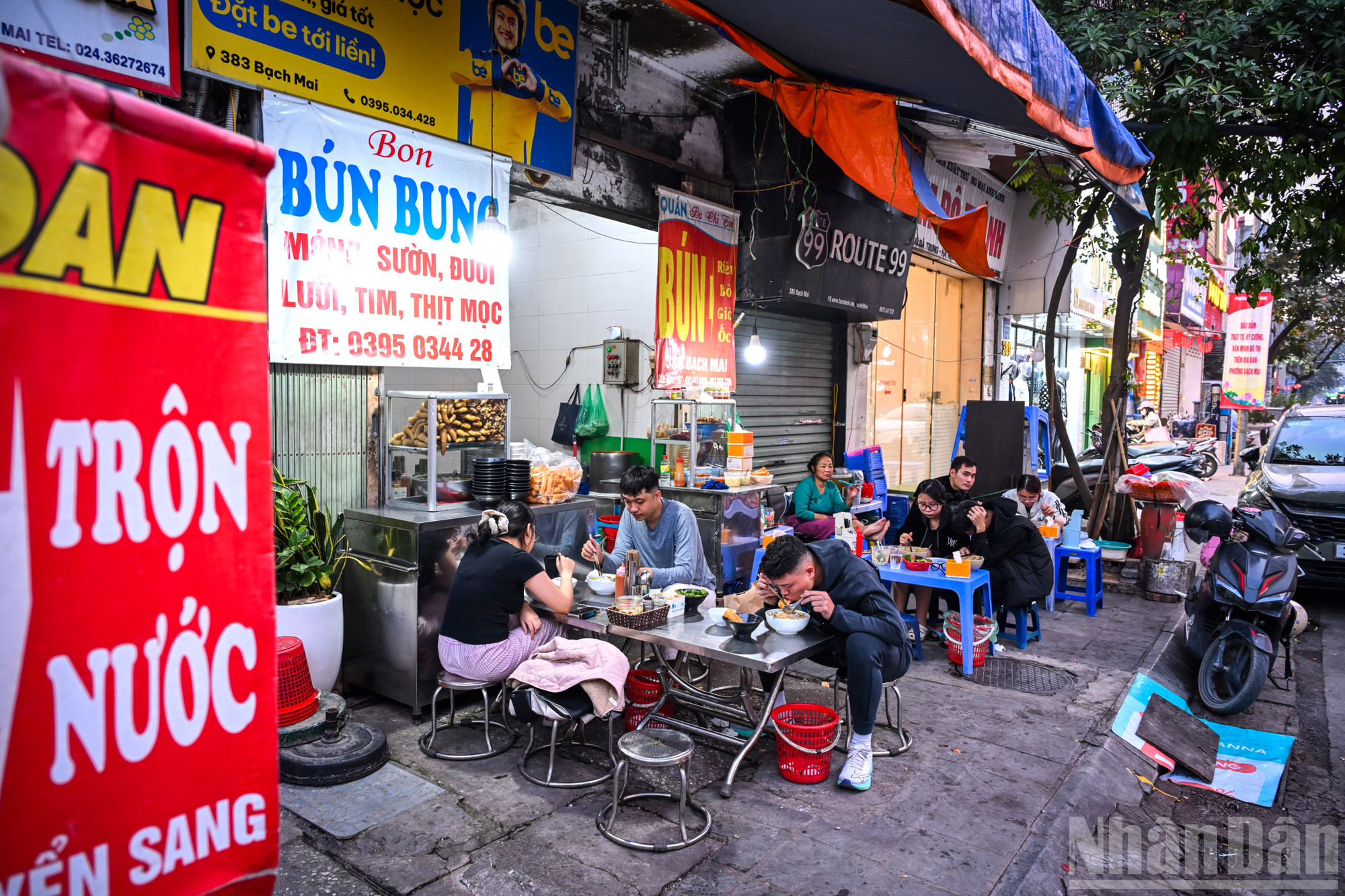 Những hàng ăn nhỏ kê bàn ghế xâm chiếm vỉa hè trên phố Bạch Mai.