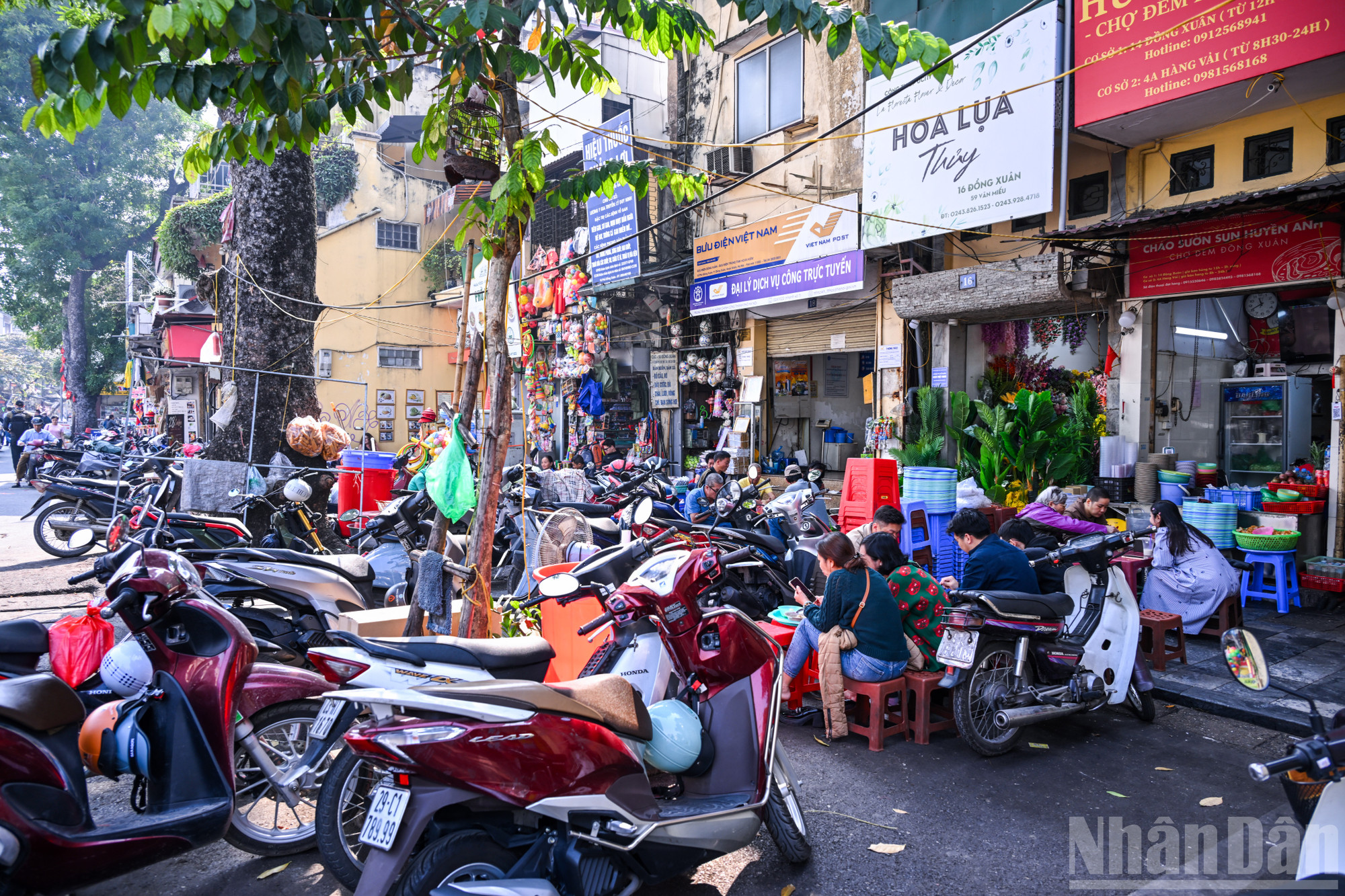 Trước một cửa hàng bán đồ ăn trên phố Đồng Xuân, bàn ghế xếp lấn chiếm vỉa hè và hàng dài xe máy dựng tràn lan ra lòng đường.