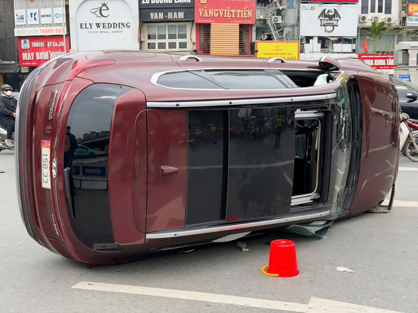 Trước đó, trên mạng xã hội lan truyền clip xe ôtô màu đỏ gắn biển kiểm soát 30H-158.xx sau khi va chạm giao thông với 2 xe ôtô cùng chiều, mất lái rồi lật nghiêng.