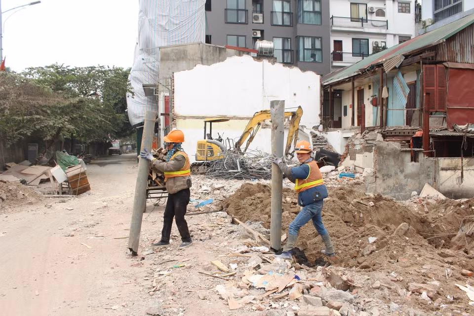 Nhân viên các đơn vị viễn thông, cáp... thu dọn đường dây để đảm bảo an toàn công tác giải phóng mặt bằng. (Ảnh: Nguyễn Thắng/TTXVN)