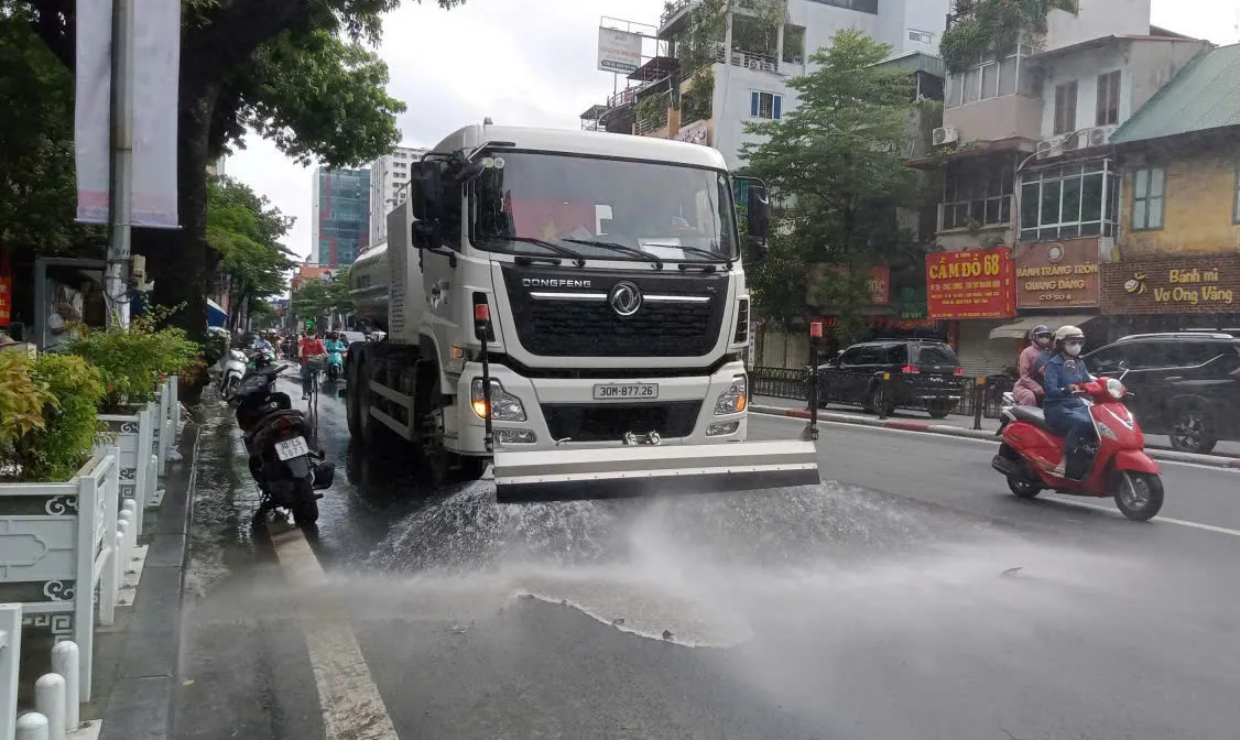 Sau khi dọn dẹp thô, Chi nhánh Đống Đa tổ chức rửa đường để đảm bảo vệ sinh môi trường, mỹ quan đô thị trên các tuyến đường.