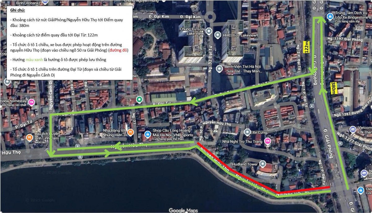 Tại nút giao Giải Phóng - Nguyễn Hữu Thọ, Thành phố cấm các phương tiện ô tô rẽ trái trực tiếp từ đường Giải Phóng vào đường Nguyễn Hữu Thọ nhằm giảm xung đột dòng xe. Thay vào đó, các phương tiện từ Giải Phóng có nhu cầu đi Nguyễn Hữu Thọ sẽ di chuyển theo lộ trình: Giải Phóng quay đầu tại khu vực số 1187 Giải Phóng rẽ phải vào đường Đại Từ tiếp tục đi Nguyễn Hữu Thọ. Ở chiều ngược lại, các phương tiện từ Nguyễn Hữu Thọ được phép rẽ trái sang đường Giải Phóng theo sự điều tiết của hệ thống đèn tín hiệu giao thông tại nút giao.