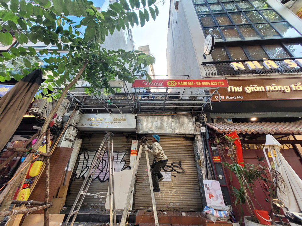 Ghi nhận trên phố Hàng Mã ngày 23/11, lực lượng chức năng phường có mặt để hướng dẫn các hộ kinh doanh gỡ bỏ mái che, dọn dẹp vỉa hè, thực hiện thí điểm theo Kế hoạch 06 của thành phố về thực hiện phường kiểu mẫu. (Ảnh: Minh Anh/Vietnam+)