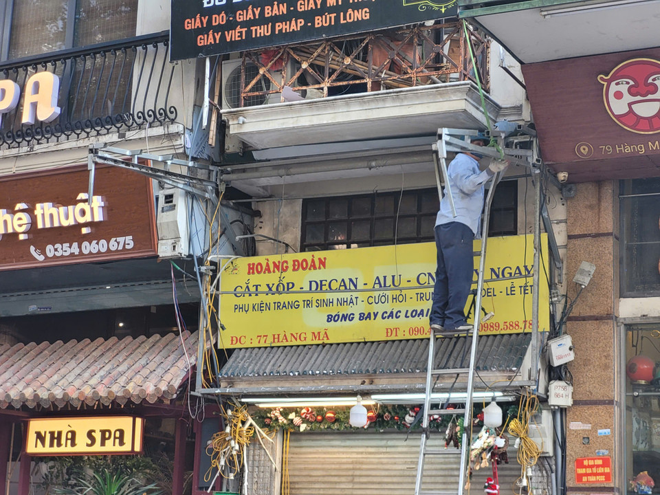 Nhiều hộ kinh doanh đã thực hiện dỡ, cất bảng biển quảng cáo để thi công gỡ mái che. (Ảnh: Minh Anh/Vietnam+)