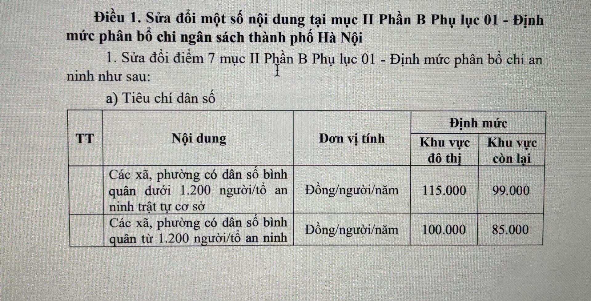 Theo đó, Nghị quyết đã quyết nghị sửa đổi một số nội dung tại mục II phần B Phụ lục 01 - Định mức phân bổ chi ngân sách thành phố Hà Nội: Sửa đổi điểm 7 mục II phần B Phụ lục 01 - Định mức phân bổ chi an ninh như sau: a) Tiêu chí dân số