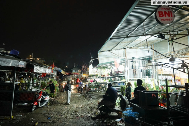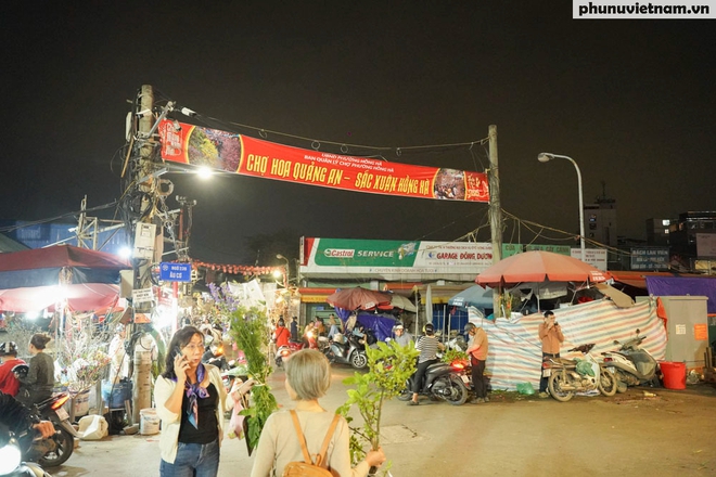 Tại chợ hoa Quảng An (phường Hồng Hà), cổng chợ vẫn rực rỡ cờ hoa nhưng không khí bên trong đã bắt đầu lắng xuống từ lúc 20h tối. Hàng trăm cửa hàng đã đóng cửa, chỉ còn vài tiểu thương ở khu vực cửa khẩu cố gắng bán nốt số hoa còn lại.