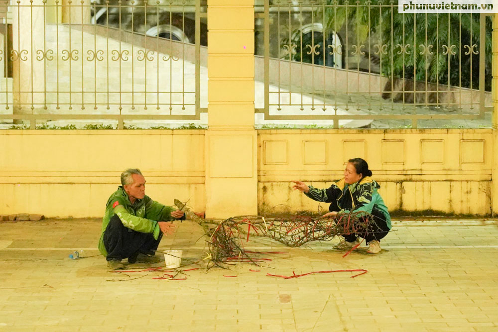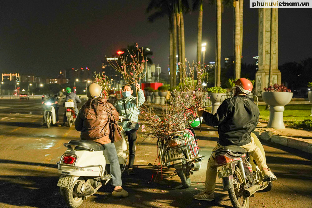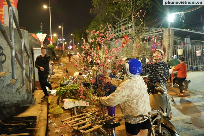 Bà Hường cho biết giá đào năm nay rẻ hơn 20-30% so với mọi năm. "Một cành đào bích đẹp giờ tôi chỉ bán 50.000 - 60.000 đồng, giá không tăng mà vẫn ít người mua", bà Hường ngậm ngùi. Đến 21h tối, ông bà thu dọn 10 cành đào còn lại để về nhà kịp đón Giao thừa.
