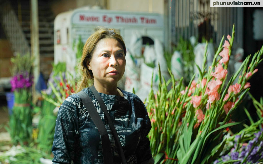 Gương mặt lo âu của chị Nguyễn Thị Kiệm (53 tuổi) tại chợ Quảng An khi giá hoa lay ơn "rơi tự do". Nếu buổi sáng giá còn 200.000-250.000 đồng/chục bông thì đến tối chỉ còn 100.000-150.000 đồng. Chị Kiệm dự kiến sẽ bán đến 22h đêm để xả nốt hàng.