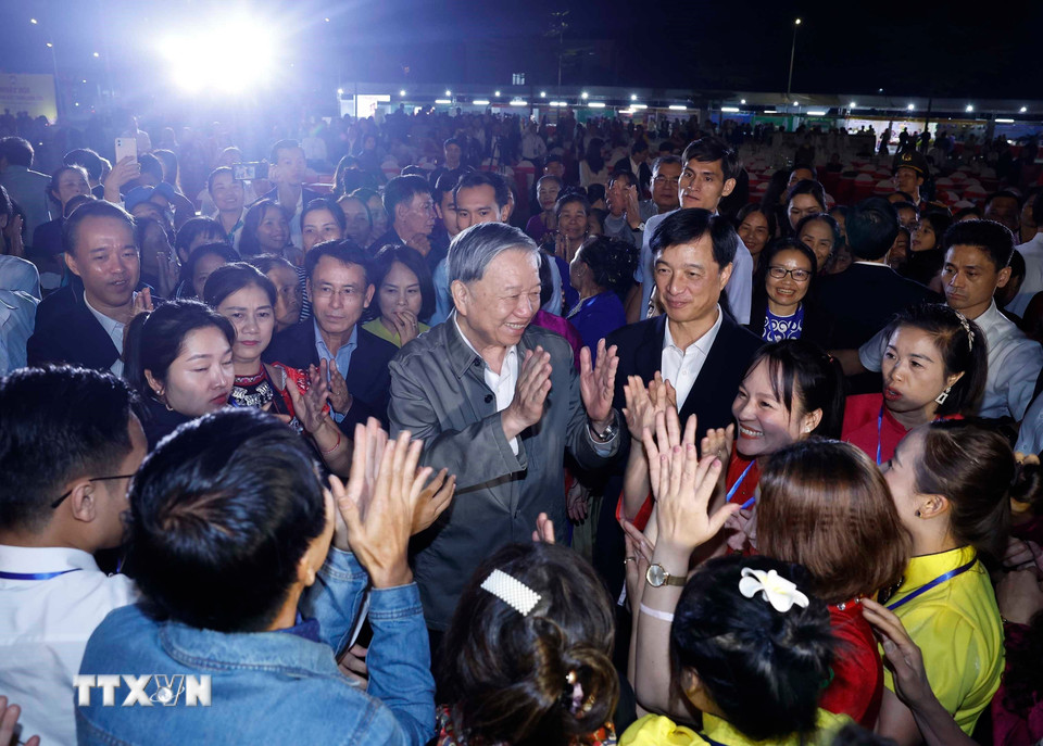 Tổng Bí thư Tô Lâm, Bí thư Thành ủy Hà Nội Nguyễn Duy Ngọc và Chủ tịch Ủy ban Trung ương Mặt trận Tổ quốc Việt Nam Bùi Thị Minh Hoài dự Ngày hội Đại đoàn kết toàn dân tộc tại phường Thượng Cát, thành phố Hà Nội. (Ảnh: Thống Nhất/TTXVN)