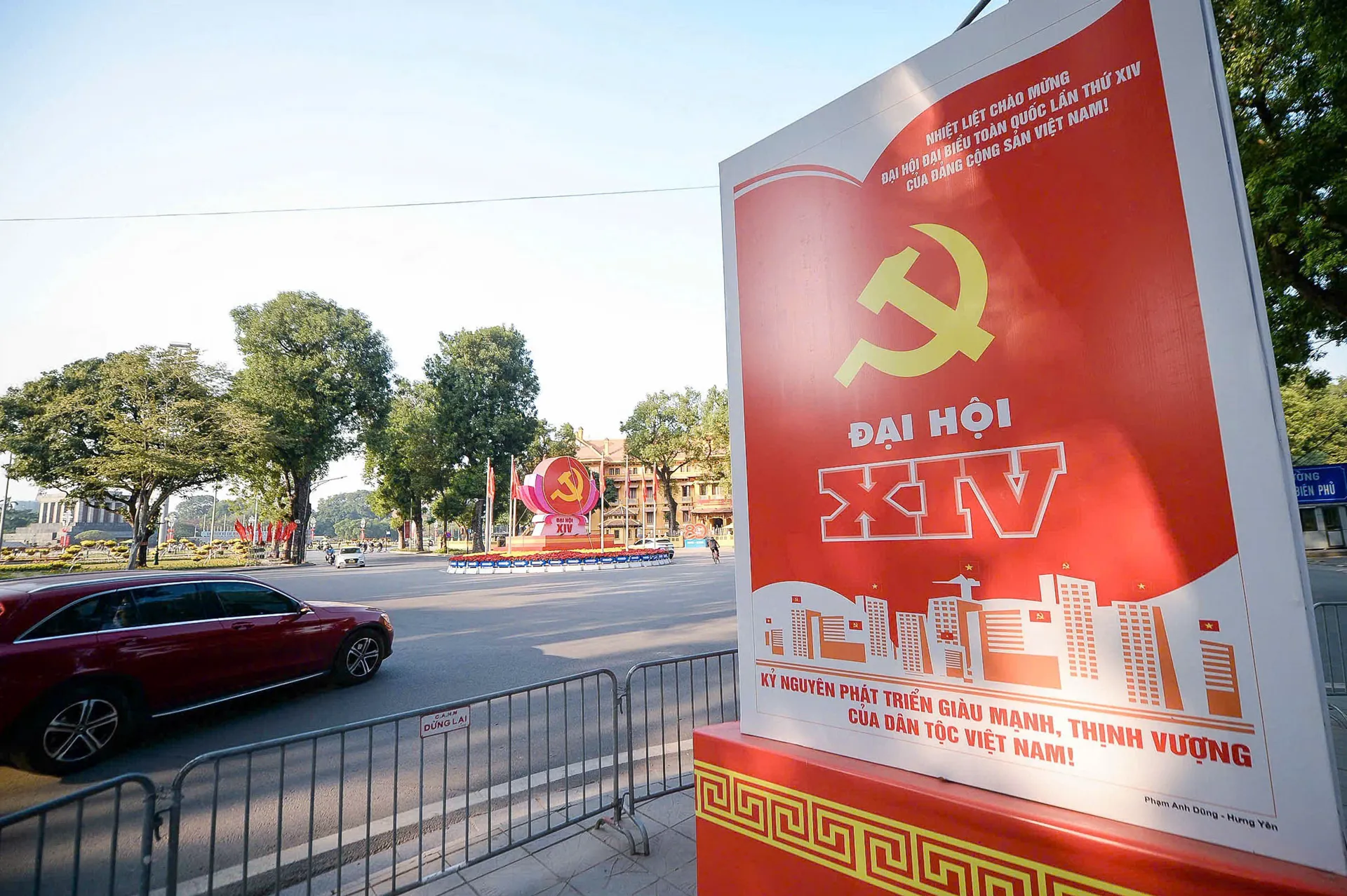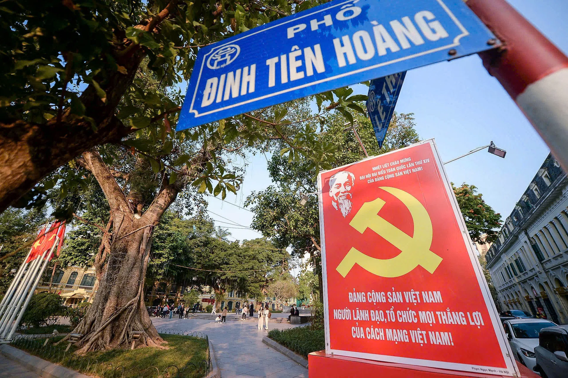Khu vực trước trụ sở UBND TP Hà Nội được trang trí cờ, pano chào mừng Đại hội đại biểu toàn quốc lần thứ XIV của Đảng.