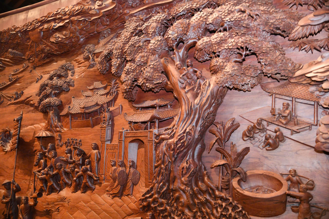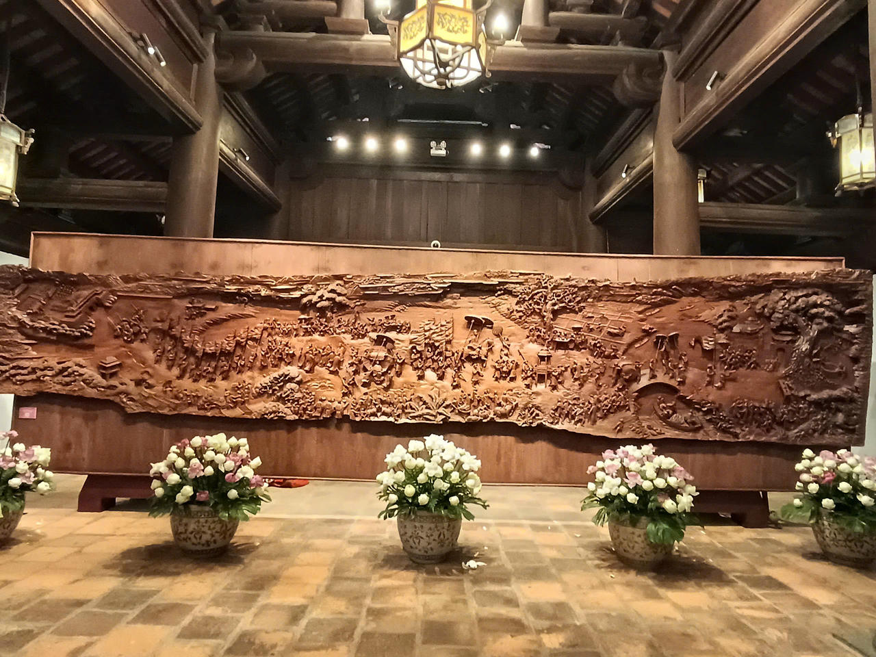 Tác phẩm “Vinh quy bái tổ” được chế tác từ gỗ Cẩm quý hiếm, với kích thước dài 8m33, rộng 1m70, dày 16cm. Ảnh: Phạm Sỹ.