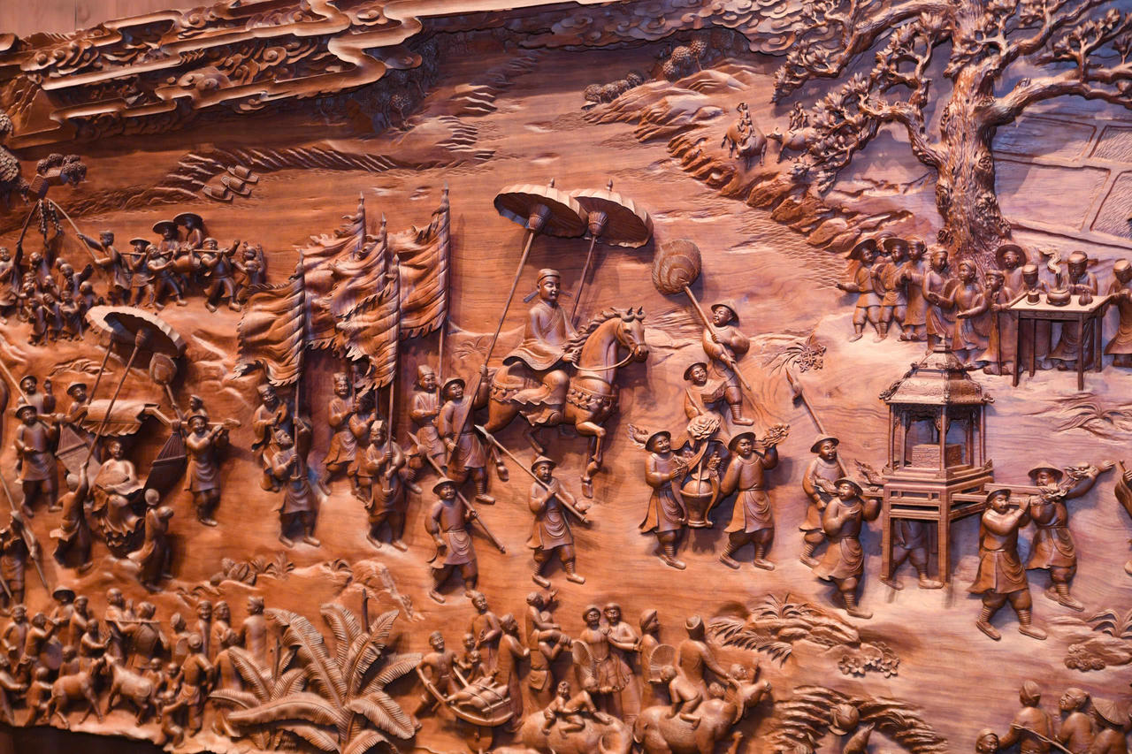 Họa tiết bức tranh gỗ "Vinh quy bái tổ". Ảnh: Phạm Sỹ.