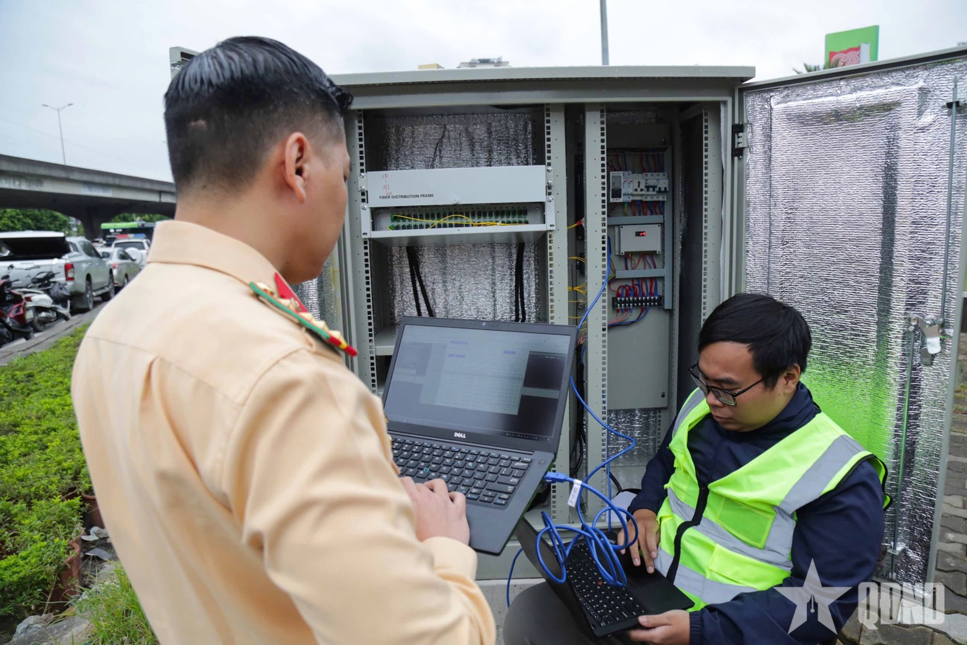 CSGT kiểm tra hệ thống đường truyền tín hiệu tại hiện trường.