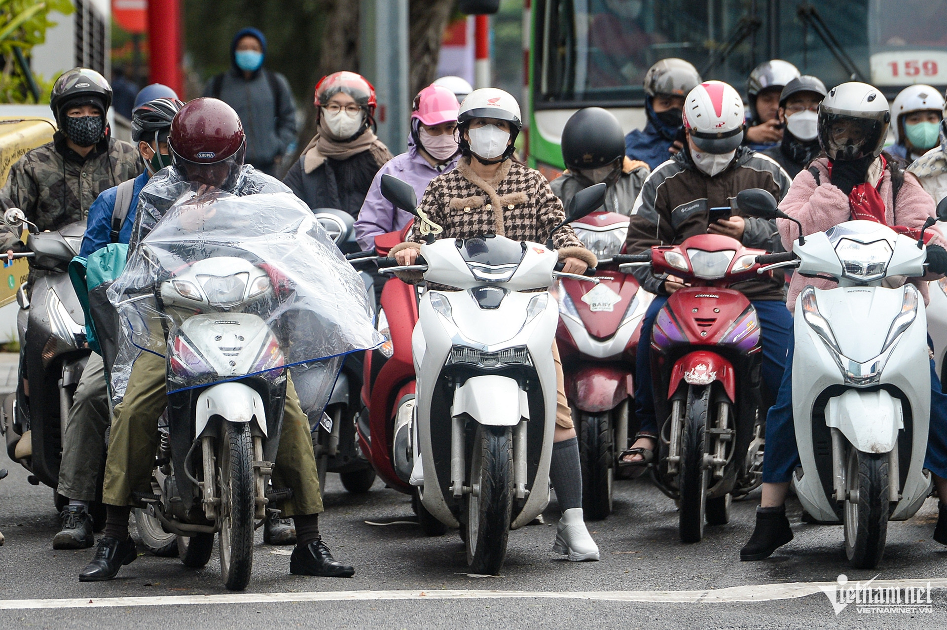Sáng sớm, ở một số khu vực có mưa nhỏ, nhiều người lao động mặc áo mưa để chống gió lạnh và ướt.