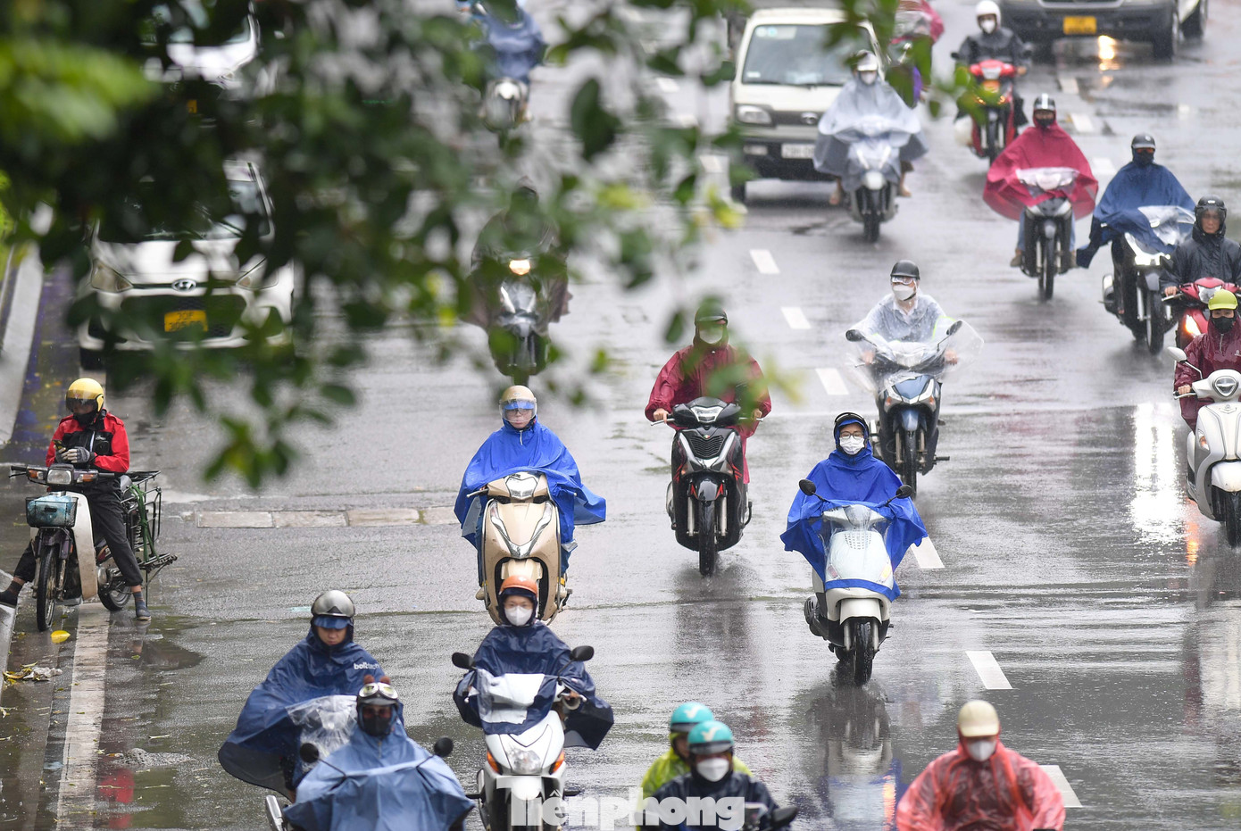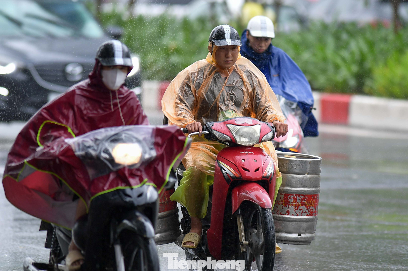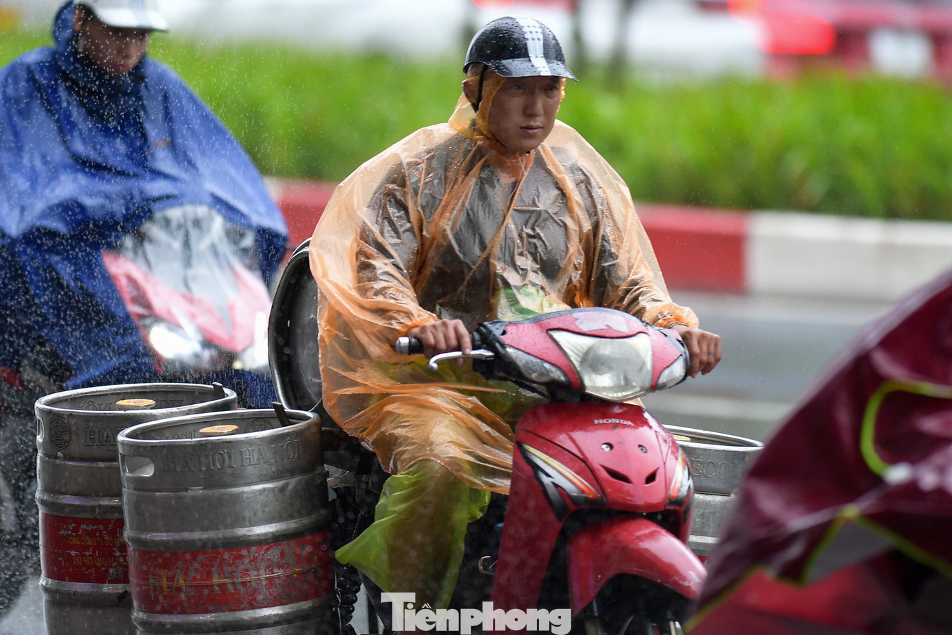 Trên những con đường dẫn vào trung tâm như Láng, Cầu Giấy, Nguyễn Chí Thanh từng dòng người nối nhau trong mưa, có cả những chiếc xe máy chở hàng nặng, phủ áo mưa nilon xanh, phóng qua những vũng nước lớn.