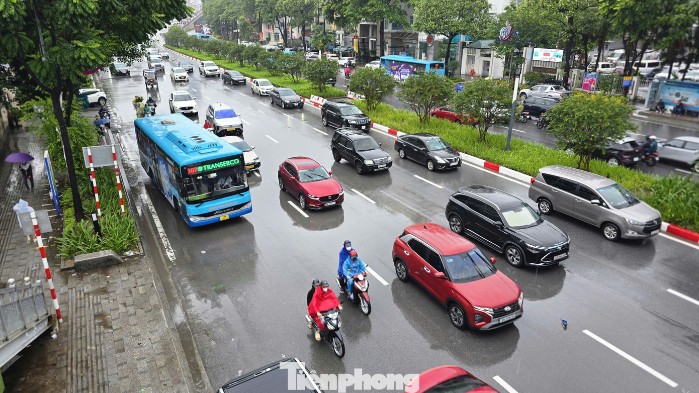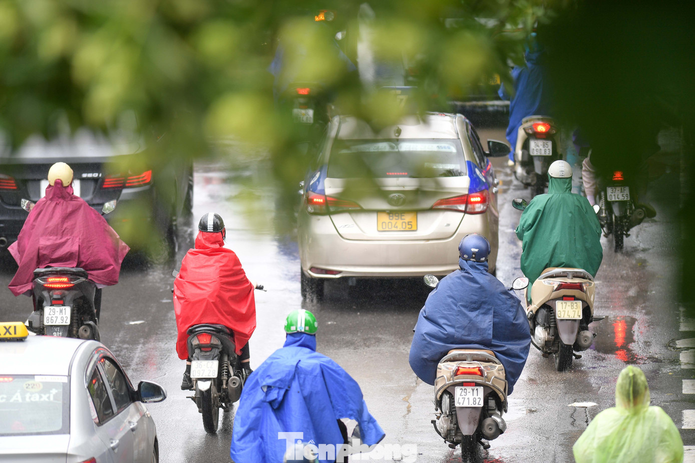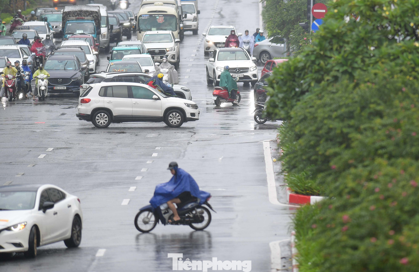 Trên những con đường dẫn vào trung tâm như Láng, Cầu Giấy, Nguyễn Chí Thanh từng dòng người nối nhau trong mưa, có cả những chiếc xe máy chở hàng nặng, phủ áo mưa nilon xanh, phóng qua những vũng nước lớn.