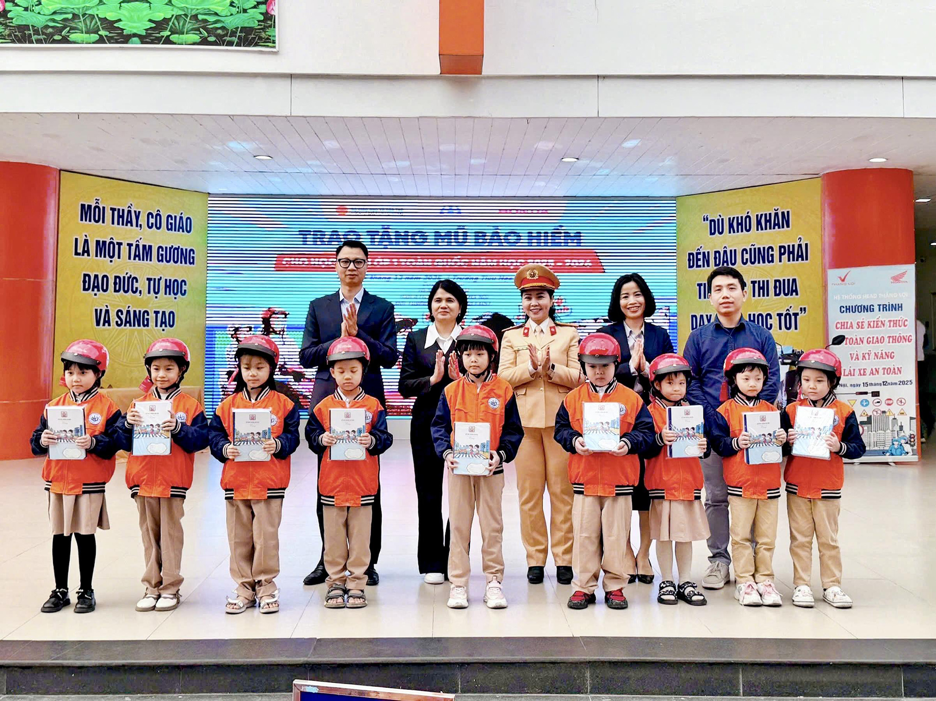 Nhân dịp này, Ban tổ chức đã trao tặng hàng trăm mũ bảo hiểm và vở cho học sinh của trường.