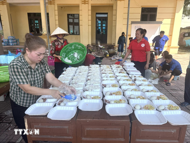 Hàng trăm suất ăn được người dân xã Trung Giã gửi tới bà con vùng bị ngập lụt phải di dời. (Ảnh: Quốc Lũy/TTXVN)