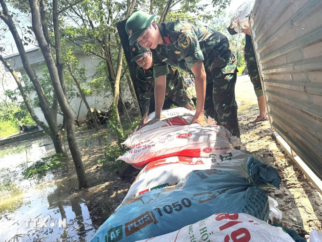 Chiến sỹ trung đoàn 68 thuộc sư 312 tham gia bồi đắp gia cố đê tại thôn Phong Mỹ, xã Trung Giã, Hà Nội. (Ảnh: Quốc Lũy/TTXVN)