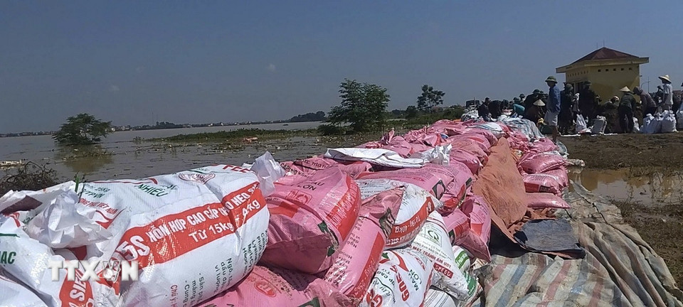 Lực lượng chức năng cùng nhân dân huy động vật tư, phương tiện, trang thiết bị khẩn cấp đắp đê sông Cầu để chống tràn vì nước lũ tiếp tục dâng cao. (Ảnh: Quốc Lũy/TTXVN)
