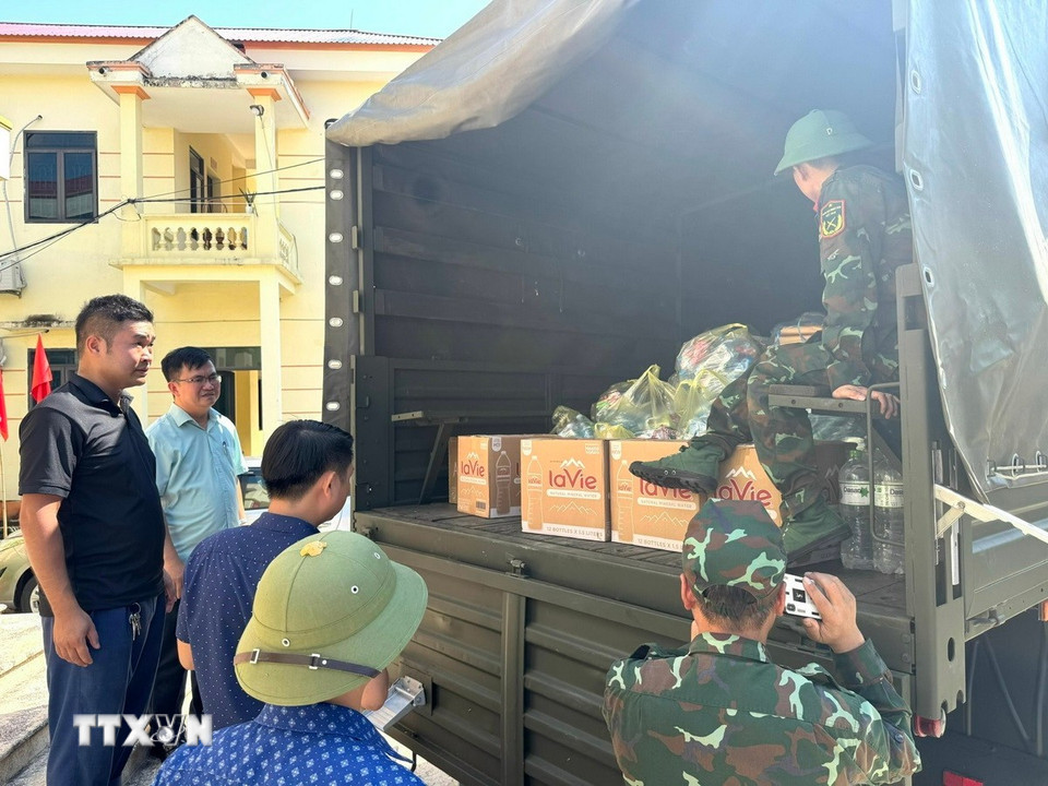 Lực lượng quân đội cùng các đoàn thể nhanh chóng chuyển hàng cứu trợ người dân bị cô lập tại xã Trung Giã. (Ảnh: Quốc Lũy/TTXVN)