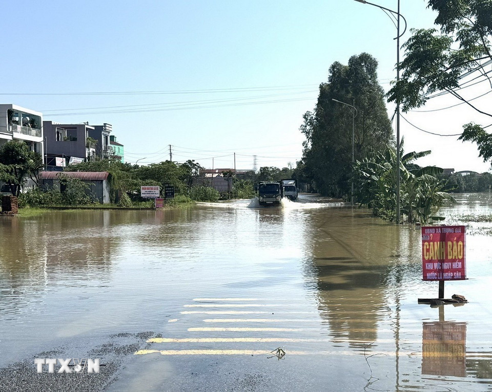 Nước sông lên cao khiến Tỉnh lộ 35 ngập sâu từ 1-1,2m (khoảng 300m, đoạn từ sân bóng Nỷ đến cầu Tú Tạo), Quốc lộ 3 ngập sâu 1,5m (đoạn qua Nhà máy Yamaha), khiến các phương tiện giao thông gặp nhiều khó khăn. (Ảnh: Quốc Lũy/TTXVN)