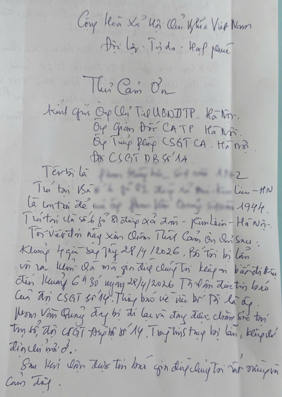 Đón bố trở về an toàn, anh S đã viết thư cảm ơn gửi tới cán bộ, chiến sĩ Đội CSGT đường bộ số 14 vì sự tận tình, trách nhiệm và nghĩa tình sâu sắc