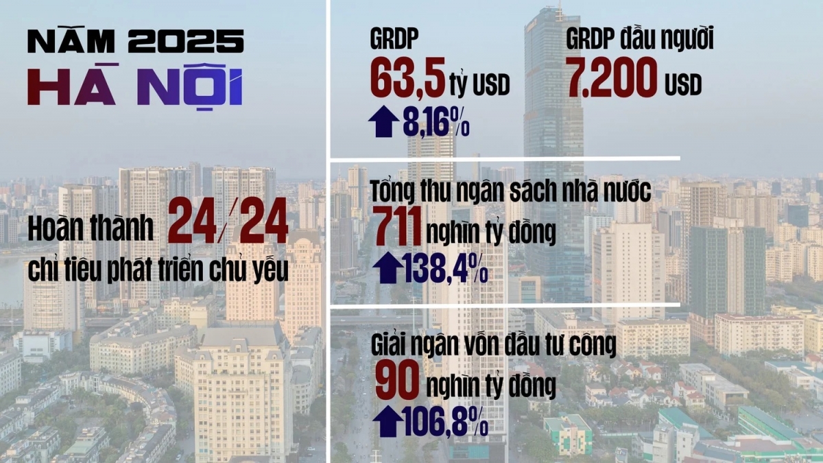 Nổi bật là tốc độ tăng trưởng kinh tế GRDP đạt 8,16%, vượt mục tiêu đề ra (8%) và cao hơn nhiều so với năm 2024 (6,52%). Quy mô kinh tế đạt khoảng 63,5 tỷ USD. Thu nhập bình quân đầu người đạt 7.200 USD; tổng thu ngân sách nhà nước thực hiện 711.000 tỷ đồng, đạt 138,4% dự toán, tăng 38,4%, cao nhất trong nhiều năm gần đây; giải ngân vốn đầu tư công đạt gần 90.000 tỷ đồng, đạt 106,8% kế hoạch Thủ tướng Chính phủ giao; công tác an sinh xã hội tiếp tục được thành phố quan tâm triển khai thực hiện; chủ động ứng phó phòng, chống thiên tai và thích ứng biến đổi khí hậu đã góp phần giảm thiểu thiệt hại, bảo đảm an sinh xã hội ổn định...
